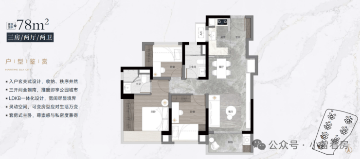 【78-79㎡三房二卫户型鉴赏】:板块最低总价南向三房二卫