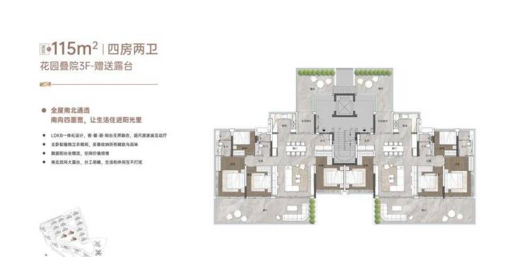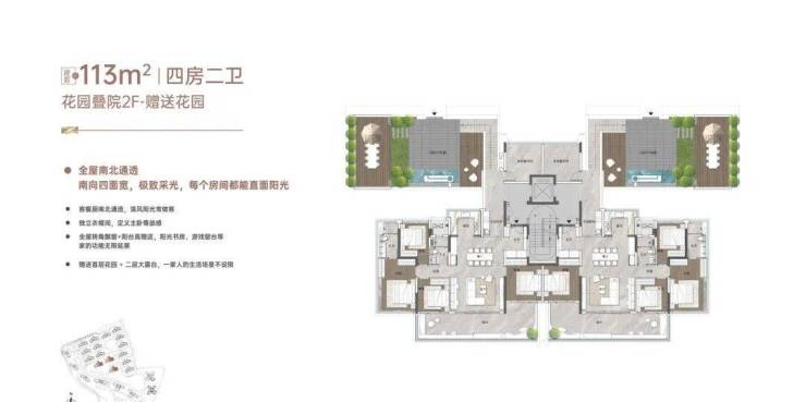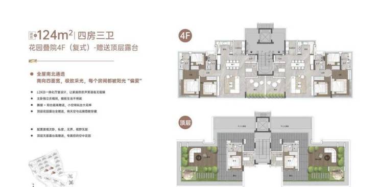 “玥境”为滨江小洋楼,主打112-124㎡低密叠院,最大亮点是超高赠送率,1F、2F户型赠送私属花园,3F赠送超大景观露台,4F复式设计,赠送顶层天台。