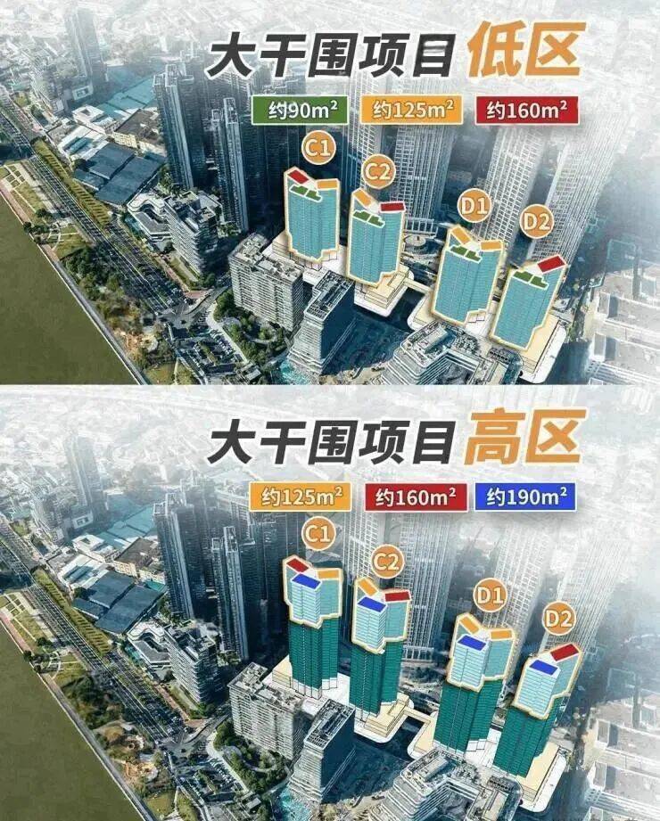 高区25-37楼,2梯3户,面积段有120、160、195平三个面积段。