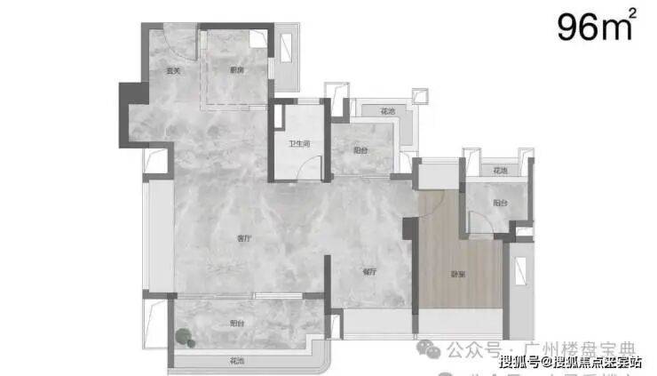 建面95平,该户型可以做三房或四房,项目的样板房是打通了一个房做了3房这样整体空间感会比较强。