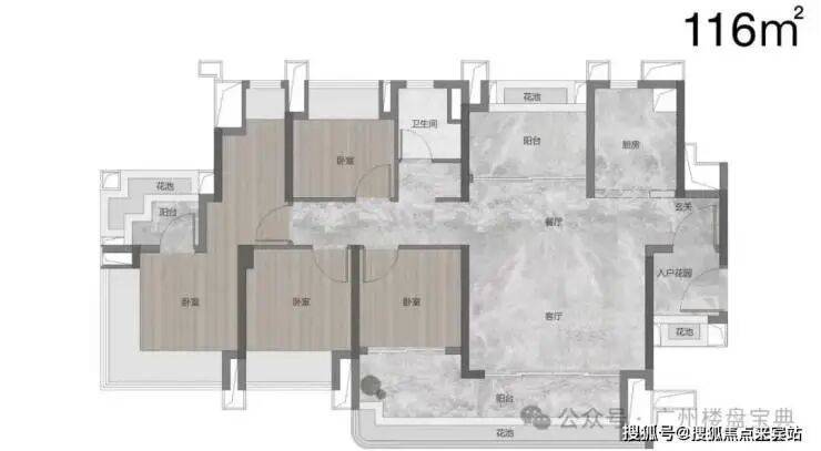 建面116平,该户型并没有做样板房,带入户花园,五开间朝南,南北对流,通风和采光都非常好。