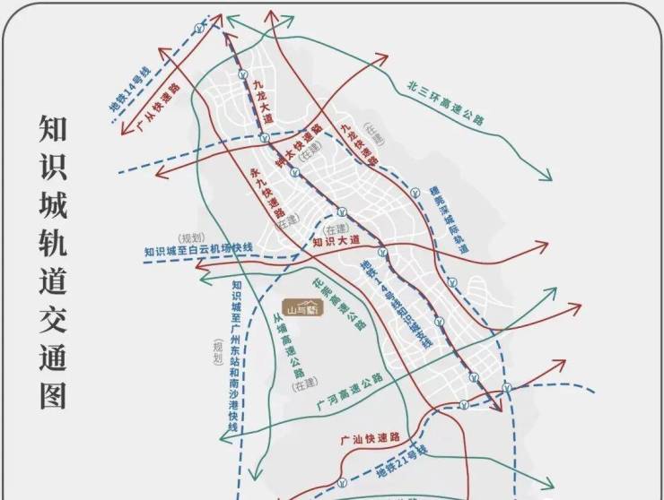 8条轨道交通:知识城至南沙(广中珠澳高铁)、知识城至广州东站(37号线)、机场联络线(白云机场至规划的增城正果国际机场)、广河高铁、新白广城轨、地铁14号线、地铁14号线支线(知识城线)、地铁21号线。其中,37号线开通后,从知识城到广州东站,只需12分钟:新白广城际预计2022年上半年完成建设并进行试运营。于2022年12月底正式开通运营,届时10分钟直达白云机场,白云机场至深圳机场也仅需40分钟。实现1小时大湾区交通圈。