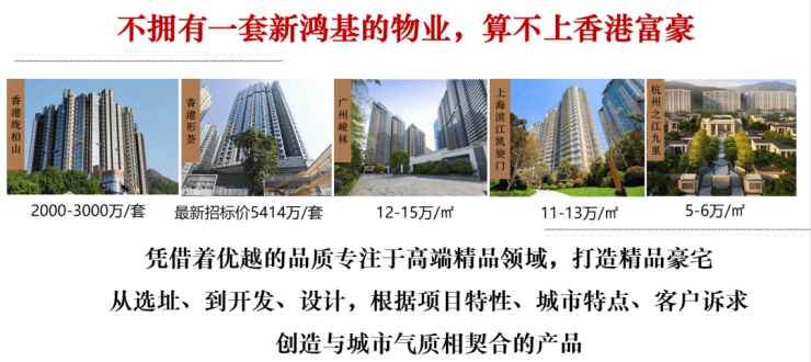 新鸿基只做豪宅和地标两种产品,旗下物业涨幅高达300%,坐享升值最强保证,多个项目创全球/当地高价,如香港天玺均价100万/㎡、上海凯旋门均价25万/㎡,广州天河峻林超16万/㎡