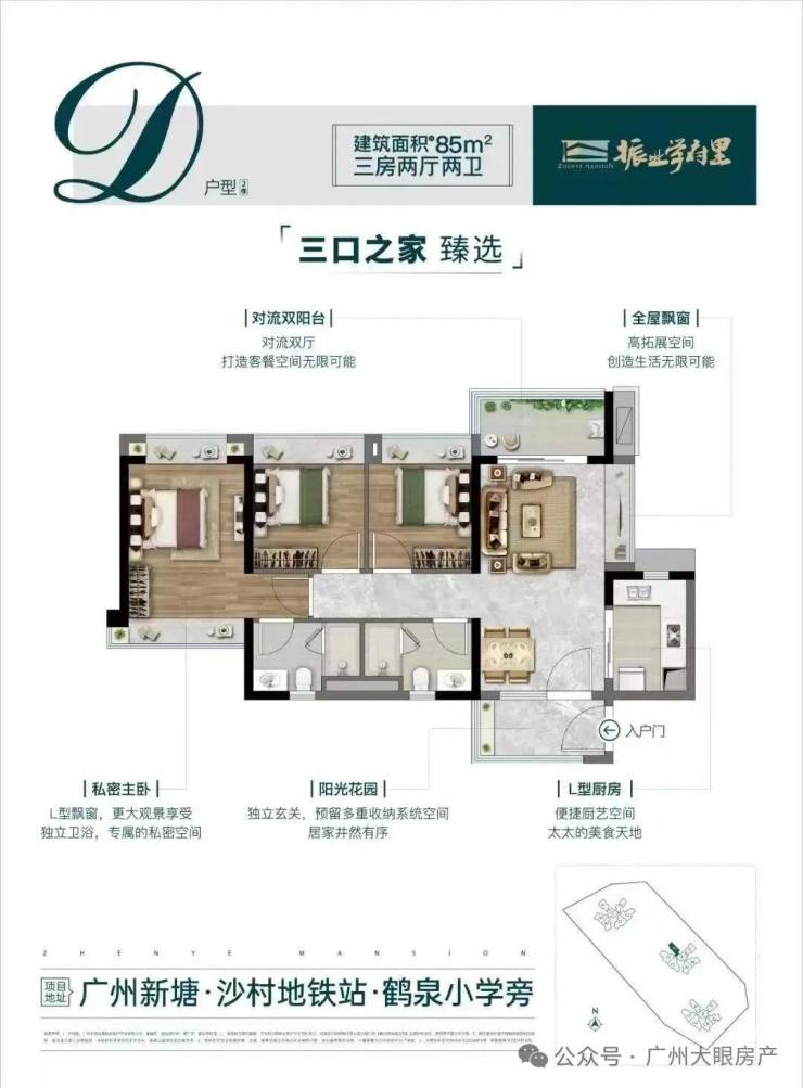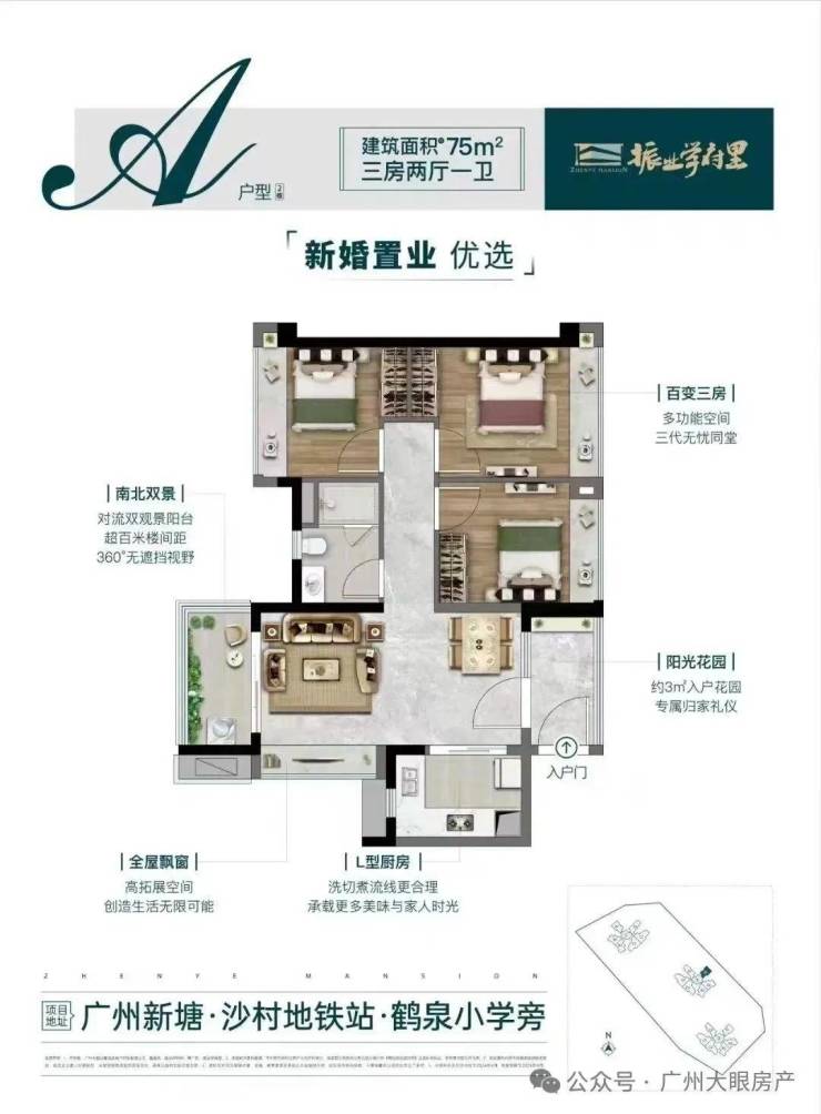 75㎡三房,项目做出了新塘唯一的单边位设计,保证了南北对流和360°景观视野。