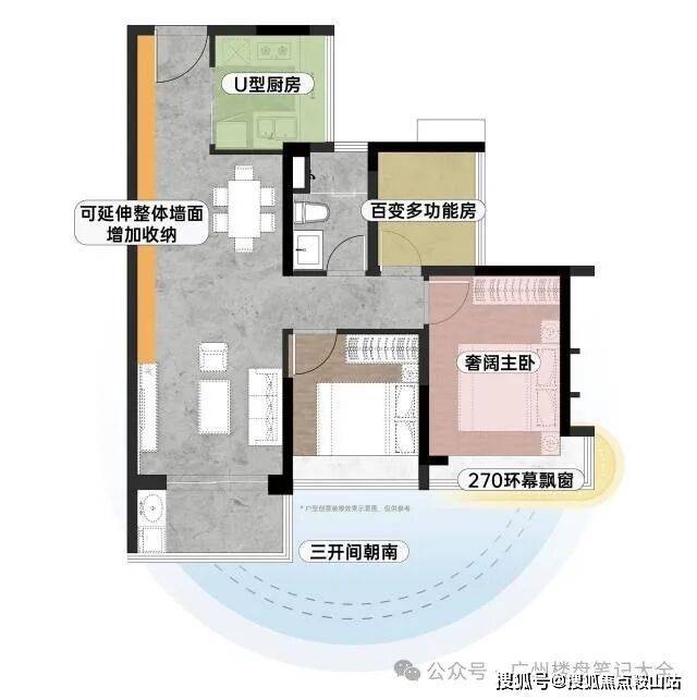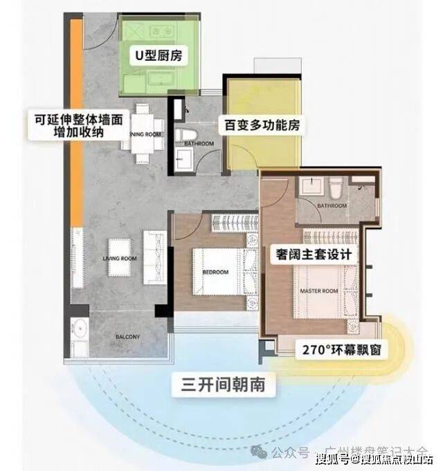 整体价值:6m³整墙收纳+南向9m采光面+5㎡全景厨房+270°景观主卧