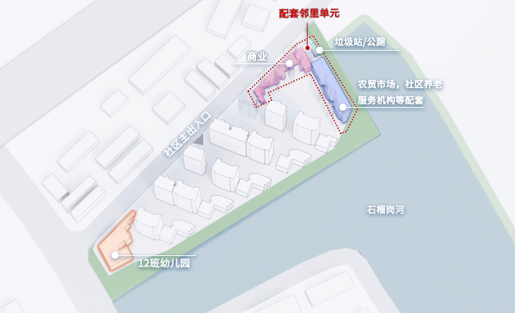 在城市东北处街角设置配套邻里单元,植入社区服务、文化娱乐、老年活动、商业购物等功能,形成一体化的配套共享空间,承载都市生活。漫步于河畔,城市的繁华和自然的宁静尽在咫尺之间。