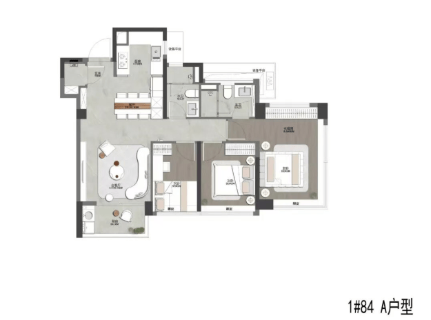 建面约105平户型,四开间构筑约12.8米南向面宽,带来超强通风、全明采光。