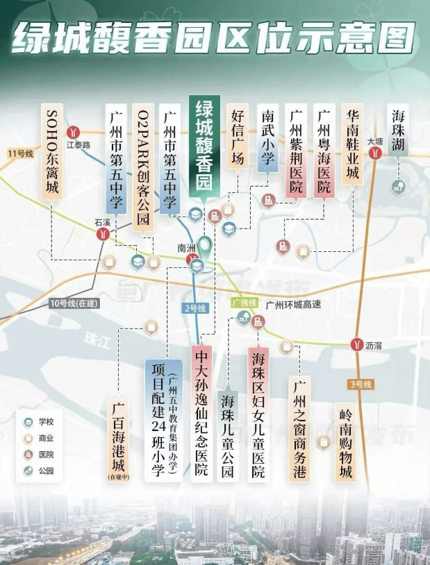 项目所在区域交通便利,地理位置优越,遥望广州塔、海心沙等著名地标,拥有浓厚的城市文化底蕴。周边配套设施完善,生活便捷,是一个集生态、文化、商业于一体的优质居住区域。