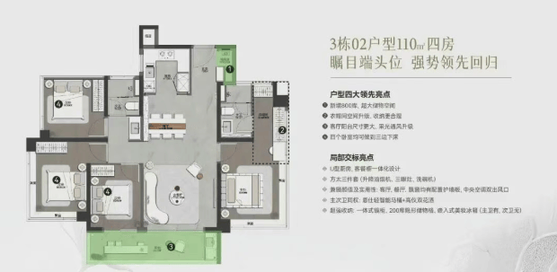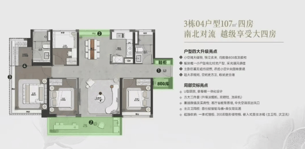 同样是南北对流的四房户型,做到了4.5开间朝南。