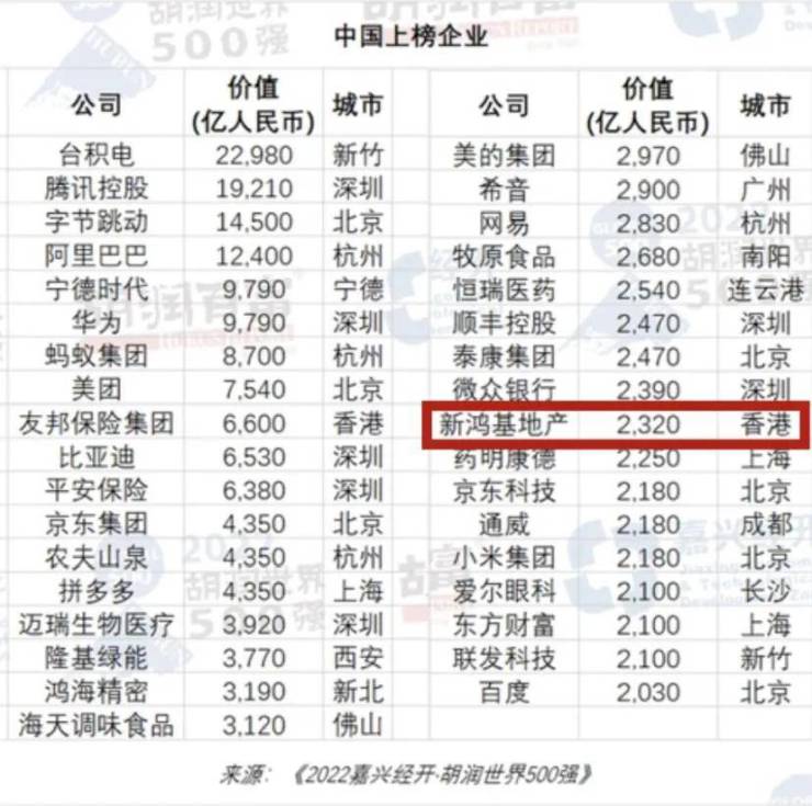 2022年胡润世界500强榜单中,全球仅7家房地产企业上榜,其中中国只有新鸿基地产一家,成为价值最高房企。