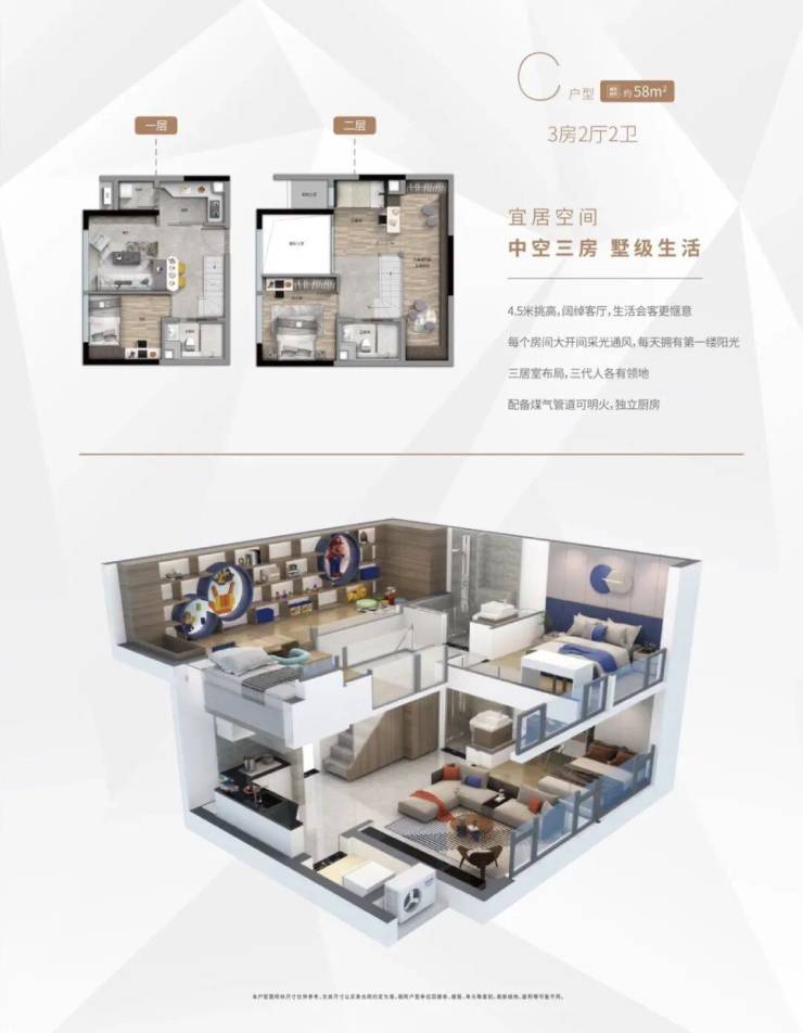 4.5米层高复式,部分户型可明火+带生活阳台(如58㎡三房);