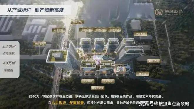 康利乾城,占地约4.2万㎡,总建面约40万㎡,由9栋建筑组成。聚合总部基地、人才寓所、企业会馆、数字艺术馆、体育馆、星级酒店、商业中心、运营中心八大板块,打造多元需求共融的美好芯城。