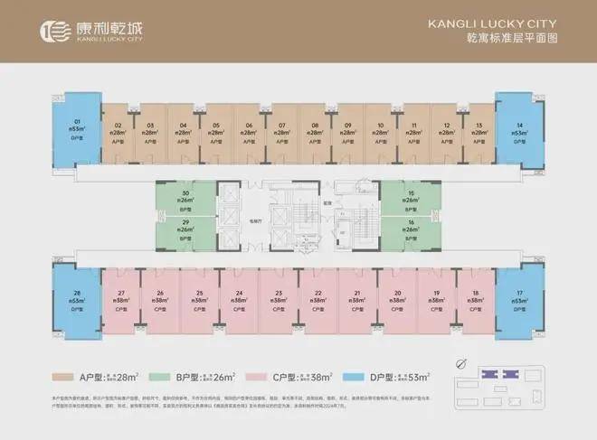 ① 首发乾寓户型: 北侧28、53㎡;南侧38、53㎡;东、西两侧26㎡,5梯30户。项目将于9月开盘;2026年精装交楼。