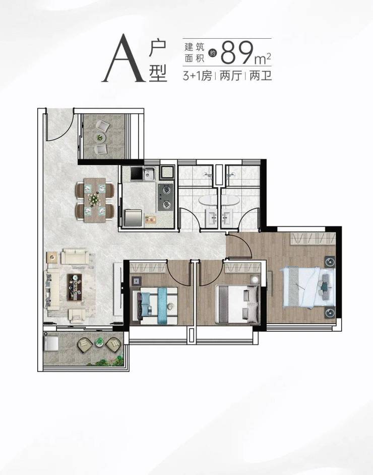 建面89平3+1房,四开间朝南, 餐客厅一体化、U型厨房的傲人设计,完美诠释动静分区,总价370-400万。