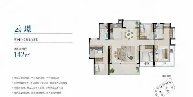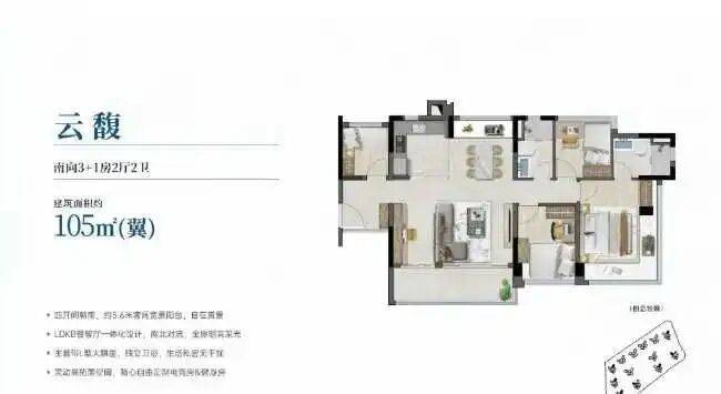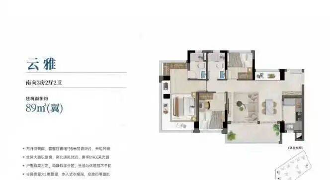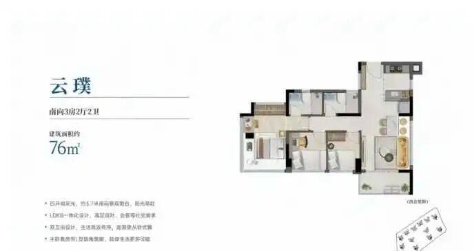 建面约76-142㎡三至五房,户户全南向享大面宽,三至五开间采光,高拓展灵动的户型,户型实用率均超100%,最高可达约115%