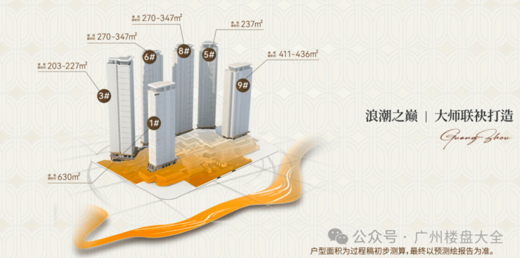 4、产品定位高端,户型以205-640㎡大平层为主,采用全封窗、弧形立面设计,配备超大玻璃幕墙,打造“世界级滨江作品”。