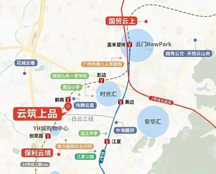 云筑上品紧邻广州地铁2号线黄边站,步行约1公里即可到达。同时,项目距离14号线鹤龙站仅200米。通过这两条地铁线路,业主可以轻松通达广州的各大核心区域,包括天河、海珠等。