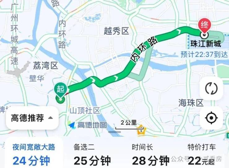 自驾去北京路:出小区上花蕾路转洲头咀隧道,再上内环至江南大道,全程8.4公里,耗时22分钟,这是不堵车的情况下,上下班内环会堵车,通勤时间会拉长。