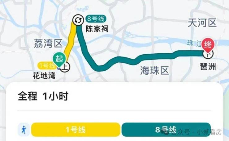 地铁去往琶洲:乘坐1号线,4个站到陈家祠换乘8号线,再坐15个站到琶洲,全程耗时1小时,相对较远。