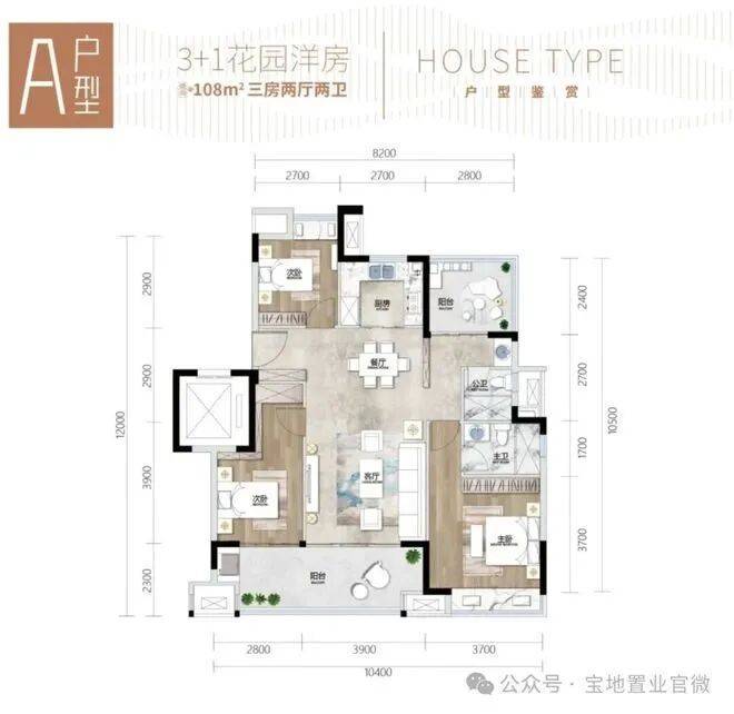 主力户型:约 108㎡3+1 四房两卫,纯板房设计,明厨明卫双阳台,空间利用率高