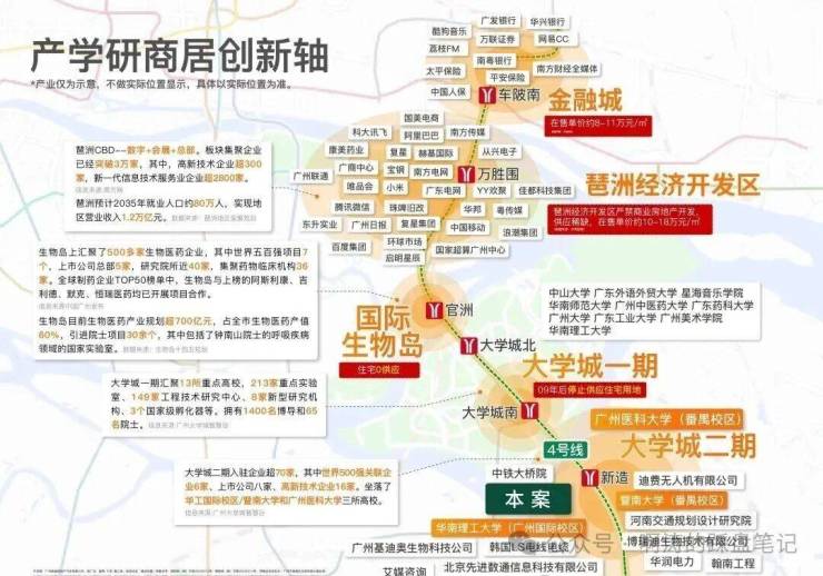 项目位于大学城二期-国际创新城板块,国际创新城共十平方公里,有暨南大学和广州医学院,整个创新城包括北翼的生物岛,核心的大学城和南翼的南岸起步区,南村地区,化龙地区,国际展贸城,在空间结构上形成了一核两翼。