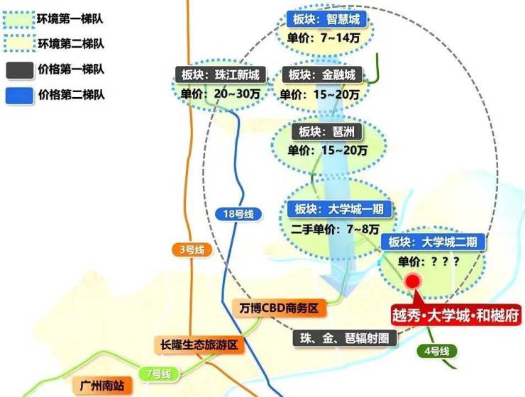 6,与大学城一期二手房价格倒挂,大学城一期产学研人才汇聚,目前二手7万+/㎡达到了番禺二手房价天花板,10年涨幅超200%!