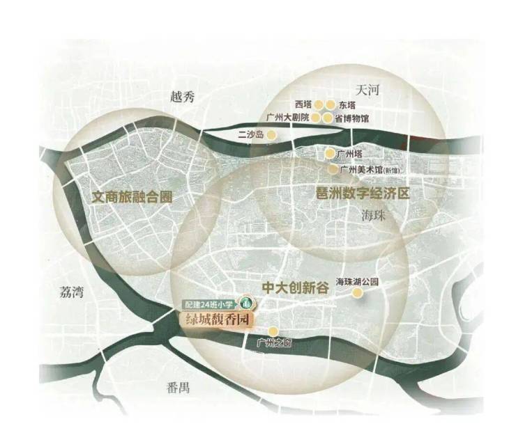 “琶洲数字经济区、文商旅融合圈、中大创新谷”三大产业板块环伺