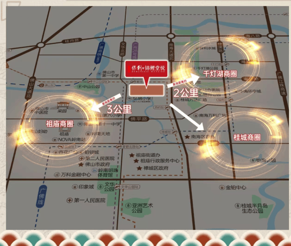 商业——自带下沉式商业;周边有鸿大广场、文沙路传统市集等,3公里内涵盖千灯湖、祖庙双城芯12大商圈;