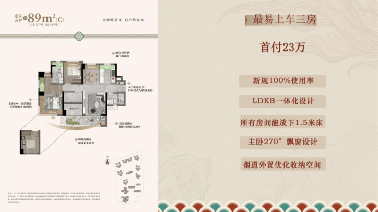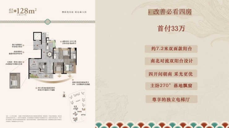 小区复刻岭南名园造园手法,打造一园三堂、五重归家礼序,融合祥瑞锦鲤IP,匠造“可行可望可游可居”的东方山水隐园,呈半围合式布局;真新规户型,面积约89-180㎡三四五房设计,100%使用率,全LDKB设计。