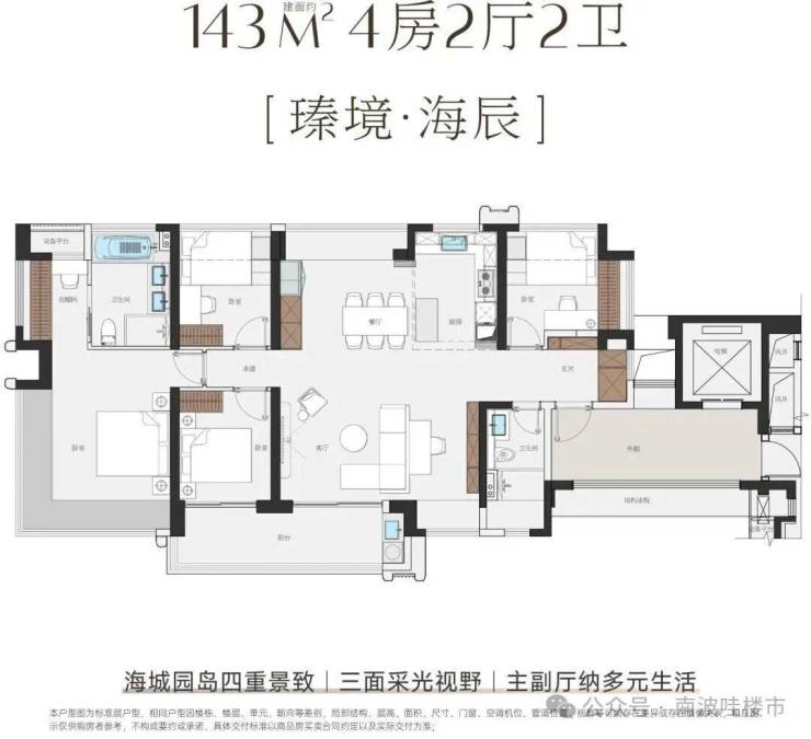 主力户型: 面积从114㎡到143㎡不等,纯四房设计