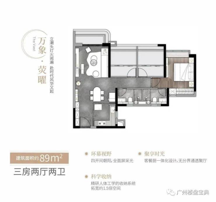 建面89平三房,四开间朝南,全面平采光,客餐厅一体化设计。 ’