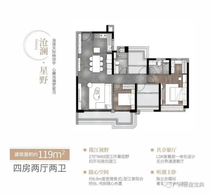 建面126平四房,7米L型大阳台,珠江尽在眼中,客餐厅一体化设计,加上超大主卧约25平。
