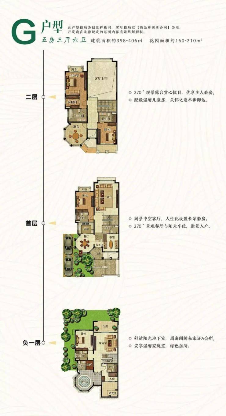 珠江国际城别墅,负一层和首层均设有绿地花园,总花园面积约160-210㎡!