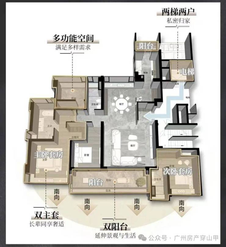 约220㎡大平层,户户四开间朝南,户户南北对流大方厅,户户两梯两户专属归家,户户双主套双阳台……
