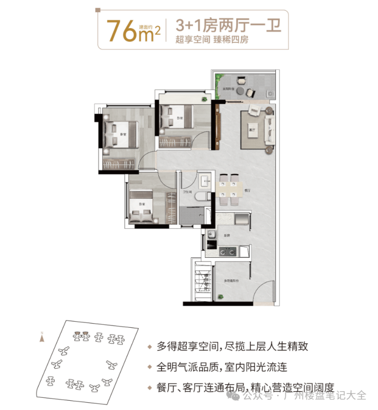 👇76㎡3+1房2厅1卫,同等面积多一房,天河稀缺小户型,视野开阔无遮挡,望自然山景
