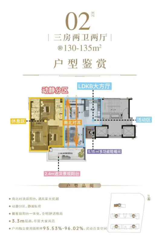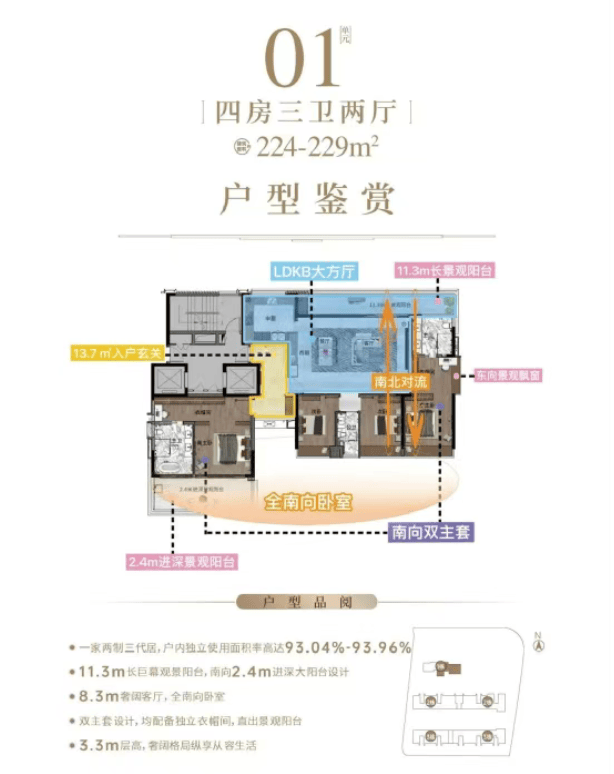 户型方面,小高层提供130㎡三房与224-229㎡四房两种选择,均严格遵循新规打造。例如,户户配备双阳台,主阳台进深最大可达2.4米,轻松转化为观景茶室或家庭休闲区;飘窗尺寸提升至800mm,足以容纳梳妆台或小型书桌,功能性与美学兼备。更值得一提的是,8楼以上为新规产品,使用率显著提升,空间利用率更高。