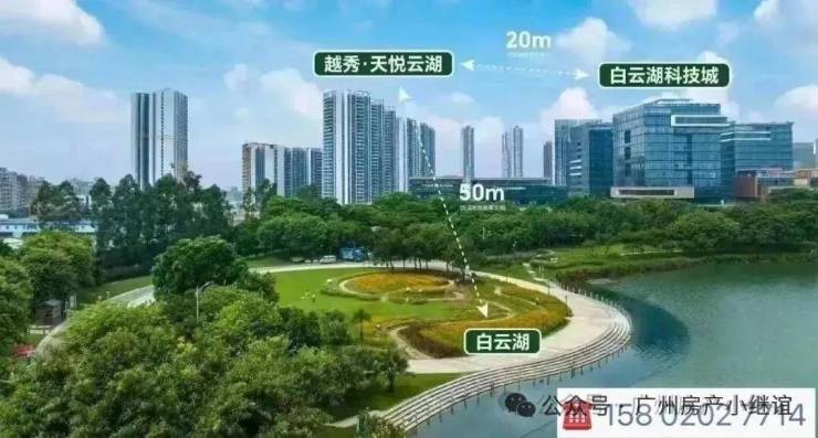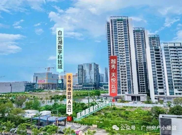 【越秀·天悦云湖】小区位于白云区白云湖数字科技城启动区,小区东北侧就是白云湖西湖,1期北门往东300米就是8号线亭岗地铁站A出口(实测)