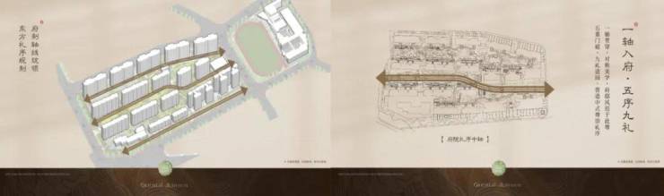 ①【板式楼栋】2.93低密府院大宅,一字板式楼栋布局,户户朝南,风光俱佳。一轴入府,以礼制中轴对称规制院落布局,尽显府院的东方美学