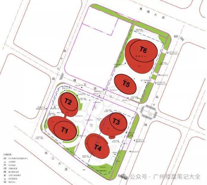 广州鹏瑞1号规划了6栋建筑,分别T1、T2、T3、T4、T5、T6。