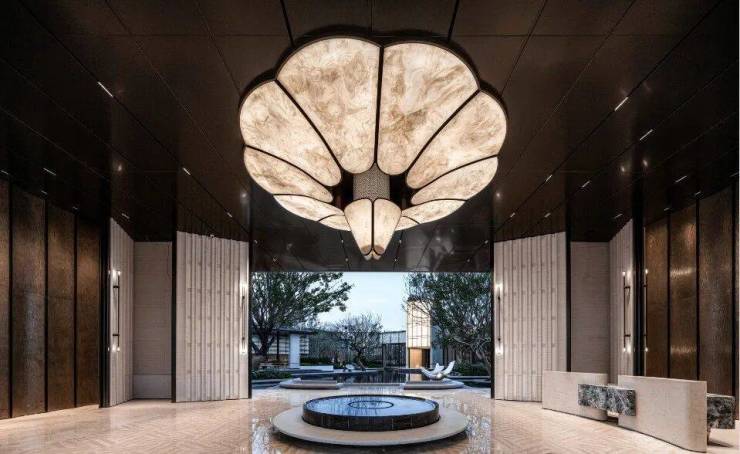 走进家门,映入眼帘的水景空间,引入奢牌美学灵感,复刻 CHANEL 水上秀场场景打造的泠汀水院,取广府百年非遗手打铜工艺,回望 10M 高琉璃光塔,约 160 米长林影游廊,串联接待大堂与室内会所,园林采用大面积的水景+绿植的方式给业主以踏水归家, 绿带环腰的归家体验。