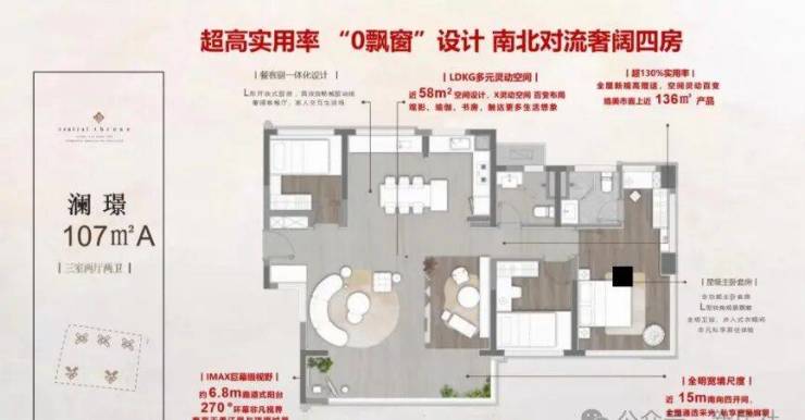 【107㎡】14.5米南向面宽+6.8米超大阳台对流+首创独立阳光女神衣厅+改善首选 约6.8米超大阳台,4.2米超大客厅开间,近38㎡LDK设计,首创独立阳光女神衣厅,新潮实用,约6.8米 270°环幕观景窗,舒居大四房改善必选!