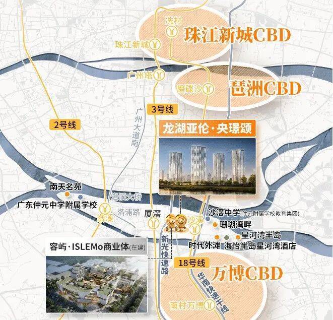 项目周边有双地铁,18号线+3号线可以直达珠江新城、琶洲等核心就业区,通勤便利。距离18号线沙溪地铁站约600-700米,18号线1站万博,2站琶洲,3站珠江新城。去3号线厦滘站有1公里左右,电鸡接驳比较方便。