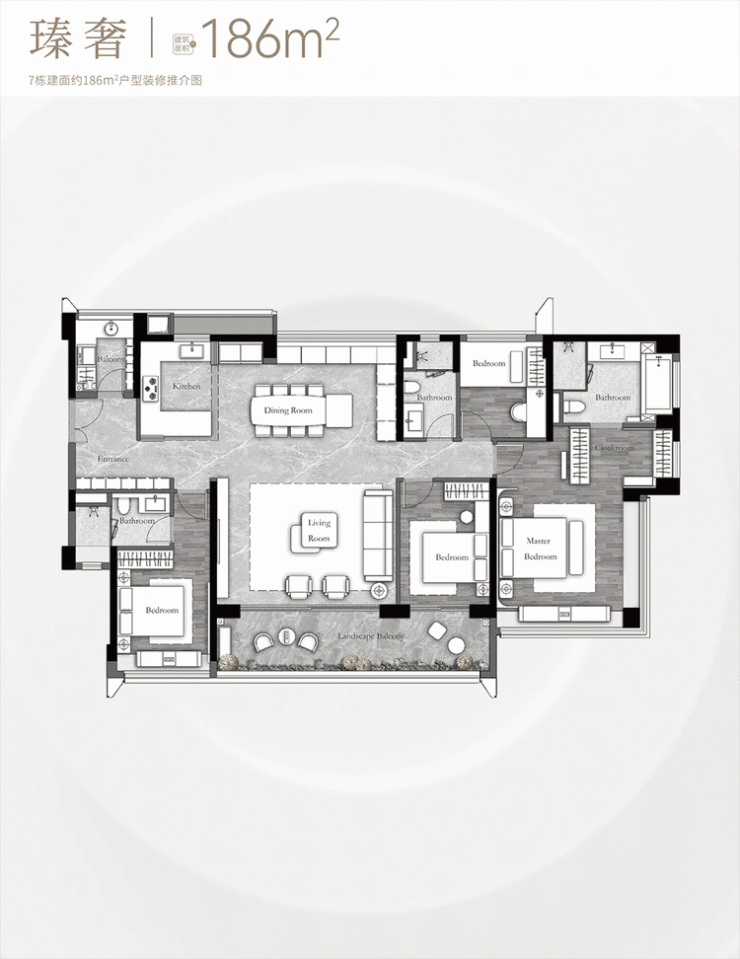 建面约186m² 4房+𝟐厅3卫+灵动空间,正南向01、02户型一线花地湾河涌景观视野,全明四开间朝南,约𝟏8.3 米极致奢幕视野,LDKB洄游路线,超 80m²多功能巨幕宽厅,多功能岛台灵活使用,精致展示柜完美收纳超 40m²端厅套房主卧,酒店总统套房享受