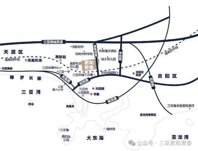 君和君泰项目位于三亚环城高速荔枝沟出口处(琼州学院对面),属于政府重点规划的月川—荔枝沟—抱坡岭片区,该区域重点规划定位为文化教育、商业贸易核心区;由学府教育区、公共服务区、行政商务区、生活配套区、文化商业区及品质居住区所组成。