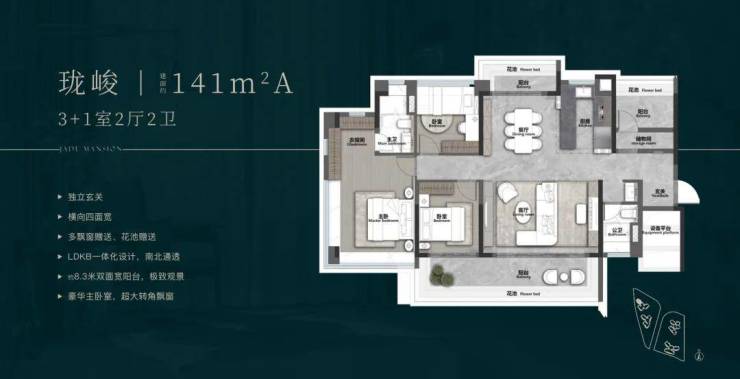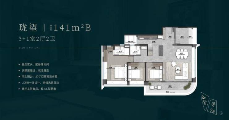 141㎡四房两卫B户型:竖厅布局,有270度景观阳台,主人房L型转角大飘窗。