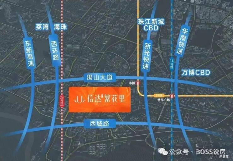 项目紧邻禺山大道、西环路等城市主干道,自驾可快速接驳东新高速、新光快速,20分钟车程可达万博 CBD,30 分钟通达海珠,荔湾,40 分钟通达珠江新城、琶洲 等核心区域。