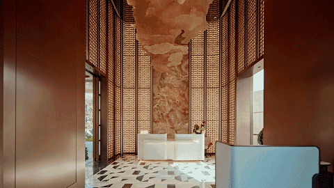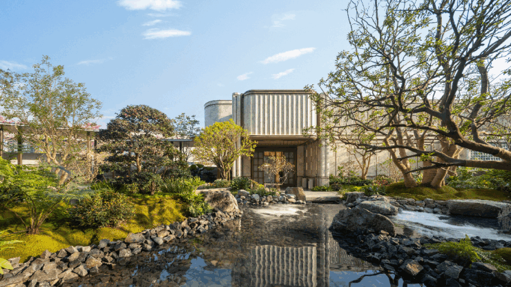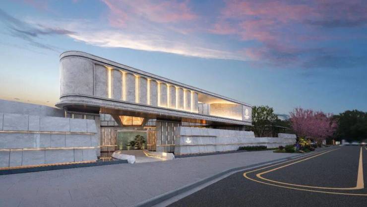 主入口的弧形线条和温润石材,营造出一种归家的仪式感,静水池倒映着天光云影,进门一瞬间就把外界的喧嚣隔在了身后。