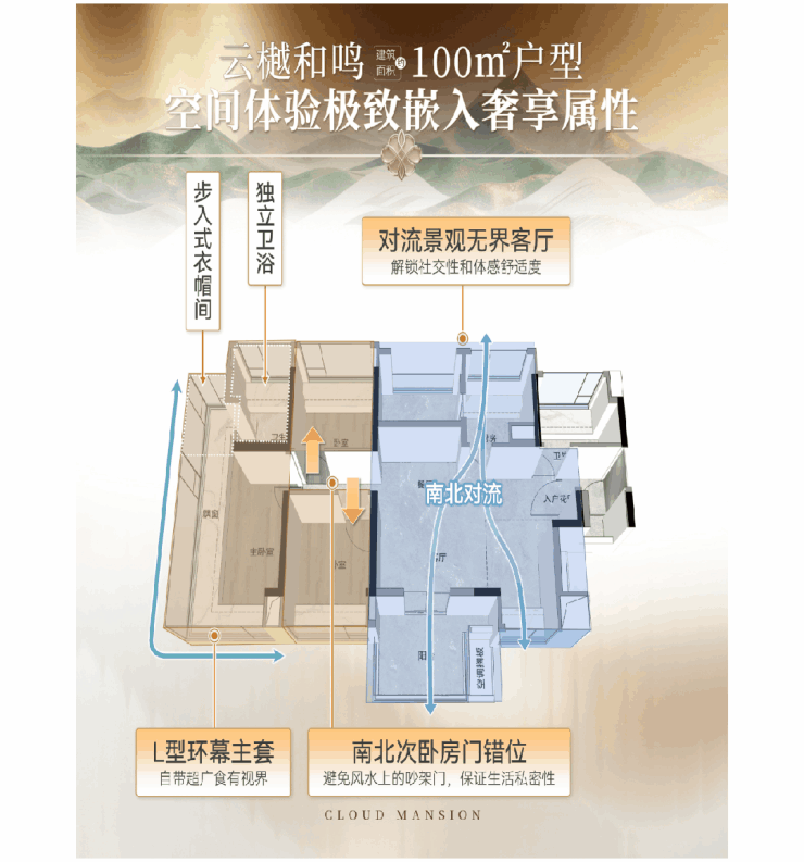 第一,整个项目三栋楼一字横向排开,互不遮挡,2号楼位于中间楼栋,不仅享有约348米的云山景观界面,而且南北都可以望园林。