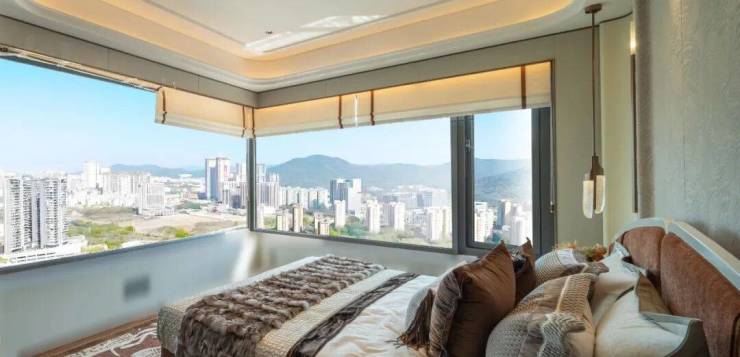 主卧空间也同样延展了这套高标准的配置思路,通过L型的观景大飘窗,躺在床上就能享受到连绵不绝的山景界面。当清晨的阳光从窗户洒入,你可以在飘窗上喝茶读书,在寸土寸金的白云新城核心区,享受“大隐隐于市”的氛围。