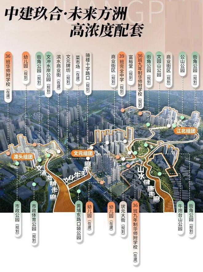 项目所在的文元组团,是文冲东旧改中配套最集中的片区。除了小区自带的12班幼儿园和36班九年一贯制学校(已官宣引入华南师范大学附属教育体系),步行范围内还有社区商业街、生鲜超市和社区卫生服务站。稍远一点,3公里内覆盖惠润广场、丰乐摩尔城等成熟商圈,三甲医院如中山大学附属第一医院东院也在15分钟车程内。周末想透气,附近的黄埔体育中心公园和滨江绿道都是不错的选择。